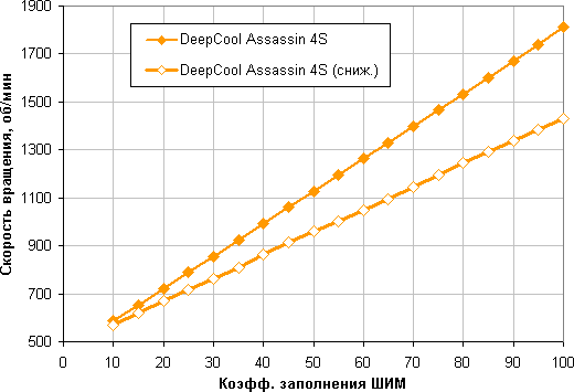 Отличный результат — плавный рост скорости вращения при изменении коэффициента заполнения (КЗ) от 10% до 100% и широкий диапазон регулировки. Отметим, что при КЗ ниже 10% вентилятор останавливается. Это может пригодиться в гибридной системе охлаждения с пассивным режимом на минимальной нагрузке. Сниж. — это в тихом режиме.