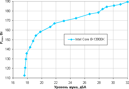 Приняв 25 дБА за критерий условной бесшумности, получим примерную максимальную мощность процессоров типа Intel Core i9-13900K, соответствующих этому уровню, это порядка 173 Вт. Гипотетически, если не обращать внимания на уровень шума, пределы мощности можно увеличить где-то до 190 Вт. Еще раз уточним: это в жестких условиях обдува радиатора нагретым до 44 градусов воздухом. При снижении температуры воздуха указанные пределы мощности для бесшумной работы и максимальной мощности возрастают.