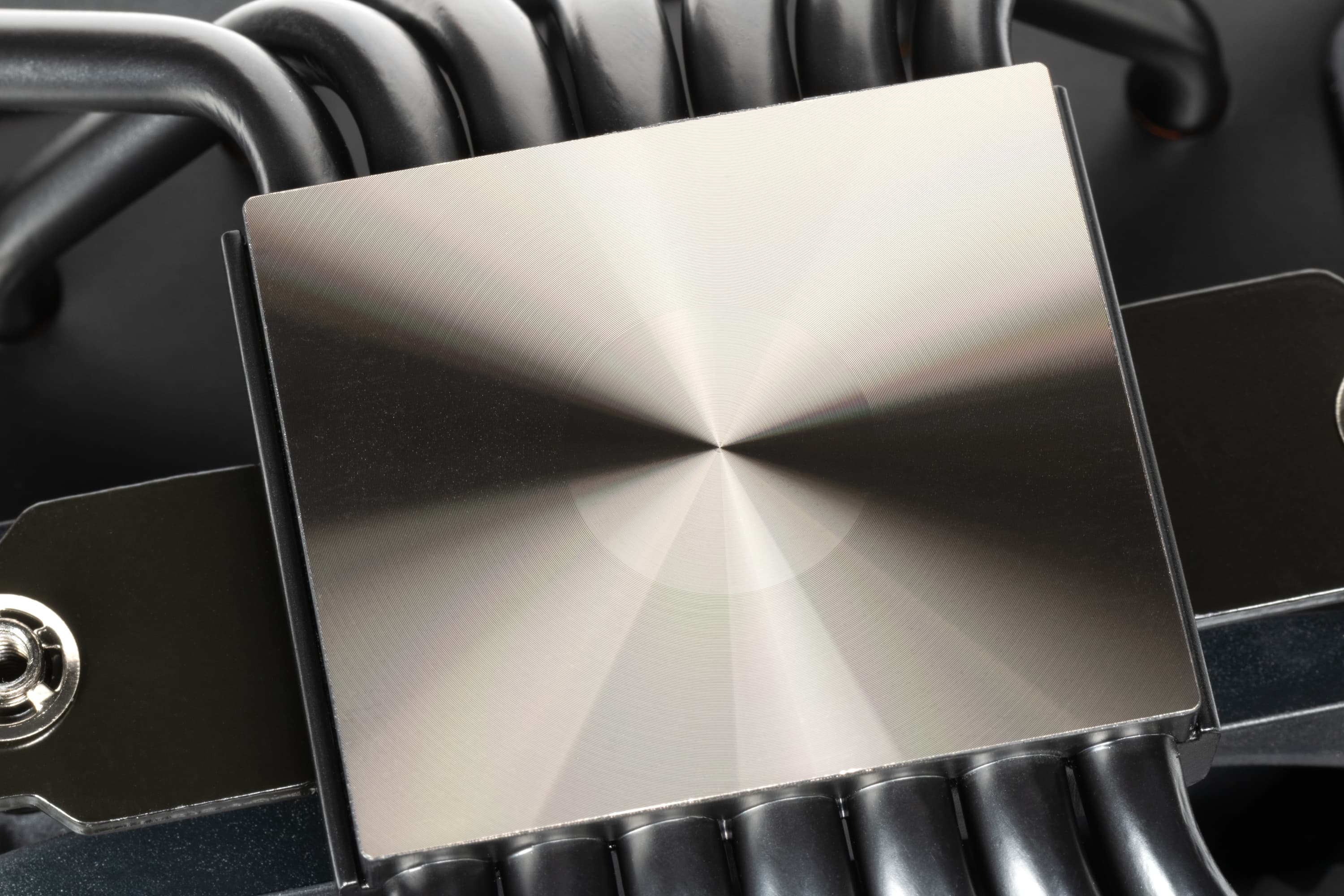 Трубки и нижняя часть теплосъемника медные. Трубки, нерабочая поверхность теплосъемника, пластины радиатора и часть деталей крепежа имеют черное полуматовое лакокрасочное покрытие. Верхняя часть теплосъемника изготовлена из алюминиевого сплава. Трубки к теплосъемнику припаяны. Подошва теплосъемника имеет очень мелкую концентрическую проточку и слегка отполирована. Поверхность подошвы немного выпуклая к центру с перепадом порядка 0,1 мм.