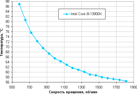 В данном тесте все ядра процессора Intel Core i9-13900K работали на частоте 3,7 ГГц. В случае тестов под нагрузкой и при измерении уровня шума скорость вращения вентилятора изменялась с помощью ШИМ при изменении КЗ в диапазоне от 100% до 10% с шагом в 5%.