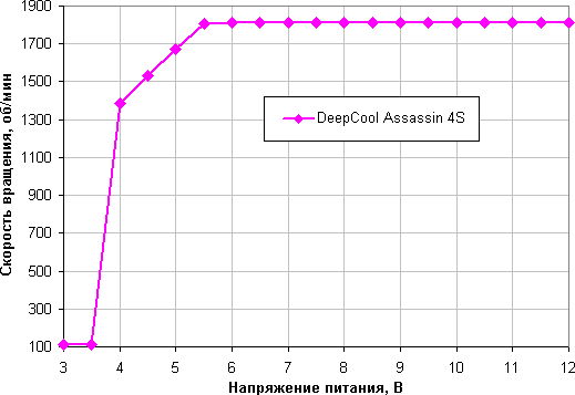 Зависимость скорости вращения от напряжения питания свидетельствует, что в вентиляторе применяется контроллер, поддерживающий стабильную частоту вращения при изменении напряжения от 5,5 до 12 В. В итоге использовать изменения напряжения для регулировки оборотов затруднительно, что, впрочем, недостатком не является. Вентилятор останавливается при снижении напряжения ниже 2,9 В и запускается от 3,9 В. Вентилятор вполне допустимо подключать к источнику с напряжением 5 В, допустимо, но нужно ли?