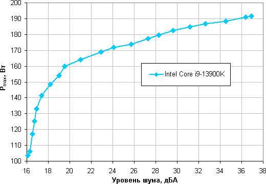 Приняв 25 дБА за критерий условной бесшумности, получим примерную максимальную мощность процессоров типа Intel Core i9-13900K, соответствующих этому уровню, это чуть порядка 173 Вт. Гипотетически, если не обращать внимания на уровень шума, пределы мощности можно увеличить где-то до 191 Вт. Еще раз уточним: это в жестких условиях обдува радиатора нагретым до 44 градусов воздухом. При снижении температуры воздуха указанные пределы мощности для бесшумной работы и максимальной мощности возрастают.