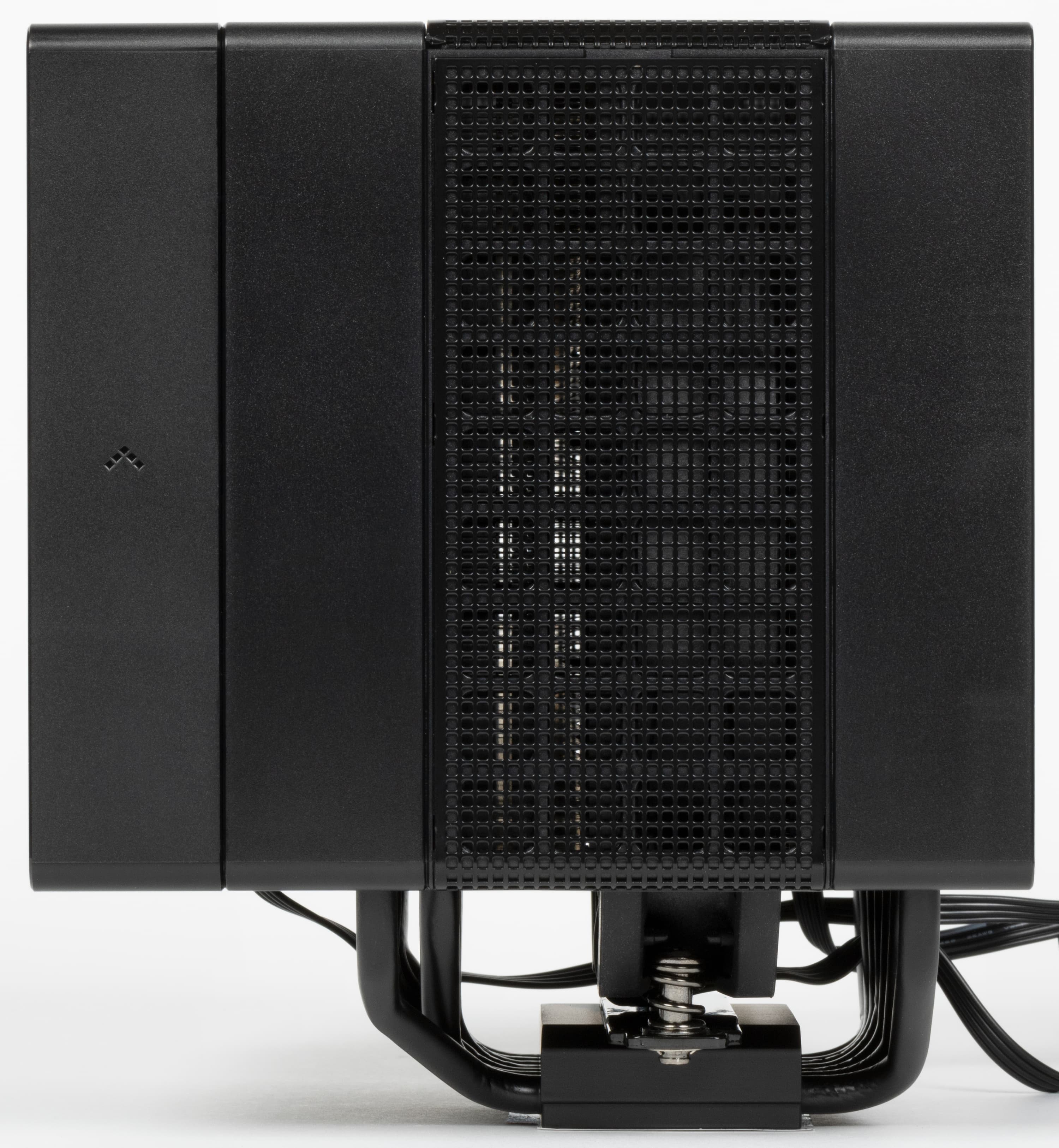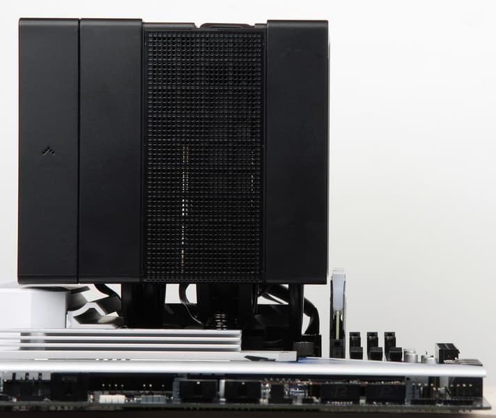 Особенностью конструкции является то, что радиатор прикрыт пластиковыми кожухами и тремя стальными сетками, при этом сетка сверху снимается (она удерживается магнитами), чтобы можно было извлечь вентилятор, установленный между двумя стопками пластин радиатора.