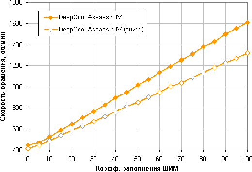 Отличный результат — плавный рост скорости вращения при изменении коэффициента заполнения (КЗ) от 0% до 100% и очень широкий диапазон регулировки. Отметим, что при КЗ 0% вентиляторы не останавливается (по крайней мере, установленные в кулер), поэтому в гибридной системе охлаждения с пассивным режимом на минимальной нагрузке такие вентиляторы придется останавливать, снижая напряжение питания. Сниж. — это в тихом режиме. Отметим, что несмотря на различие в размерах вентиляторы ведут себя практически одинаково, поэтому графики приводятся только вентилятора 140 мм.