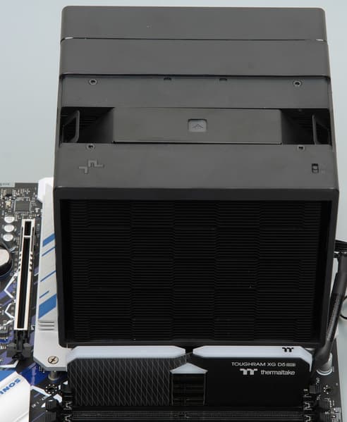 Установка кулера относительно удобная, хотя и придется снять один вентилятор, но понадобится длинная отвертка, которая, впрочем, есть в комплекте поставки. Отметим, что конструкция крепежа практически исключает перекос теплосъемника относительно плоскости крышки процессора, а также слишком слабый или слишком сильный прижим.