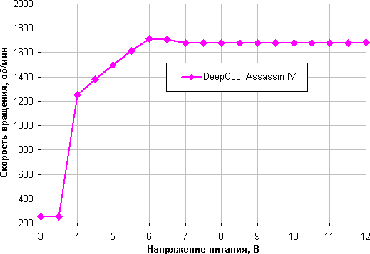 Зависимость скорости вращения от напряжения питания свидетельствует, что в вентиляторах применяется контроллер, поддерживающий стабильную частоту вращения при изменении напряжения от 6 до 12 В. В итоге использовать изменения напряжения для регулировки оборотов затруднительно, что, впрочем, недостатком не является. Вентиляторы останавливается при снижении напряжения ниже 3,0 В и запускаются от 4,0 В. Вентиляторы вполне допустимо подключать к источнику с напряжением 5 В, допустимо, но нужно ли?
