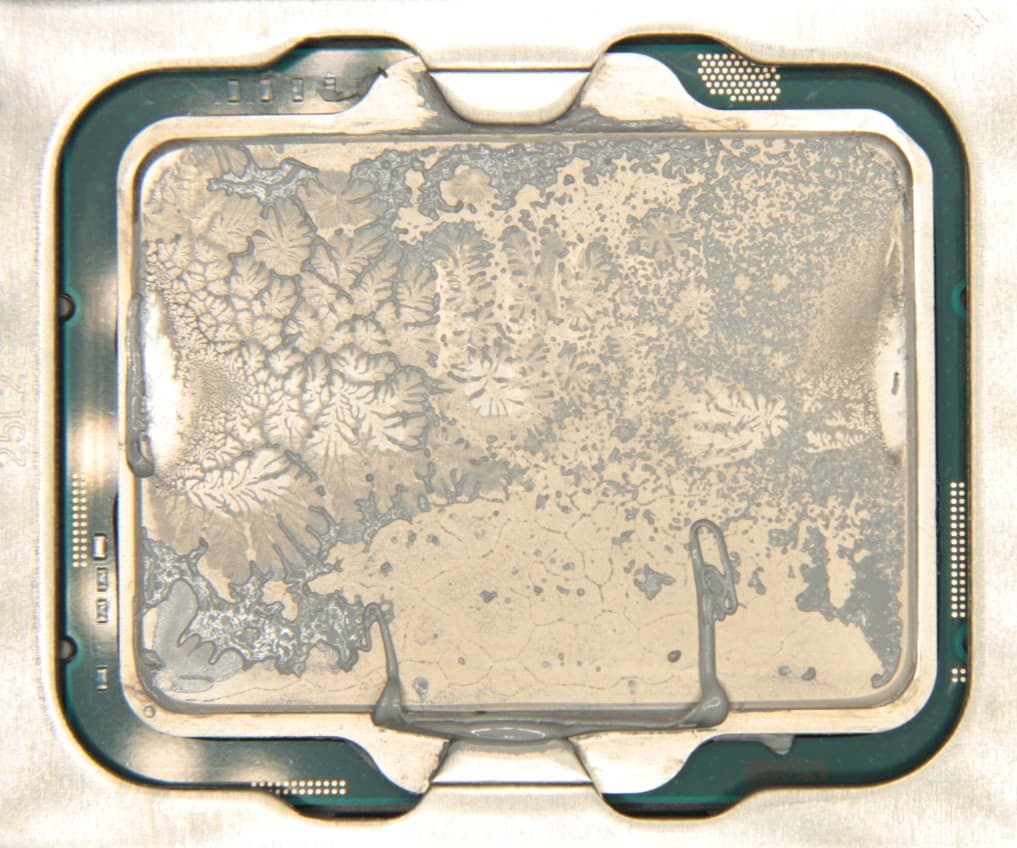 Видно, что термопаста распределилась тонким слоем по всей плоскости крышки процессора, а ее избыток выдавился по краям. Пятно плотного контакта большое.