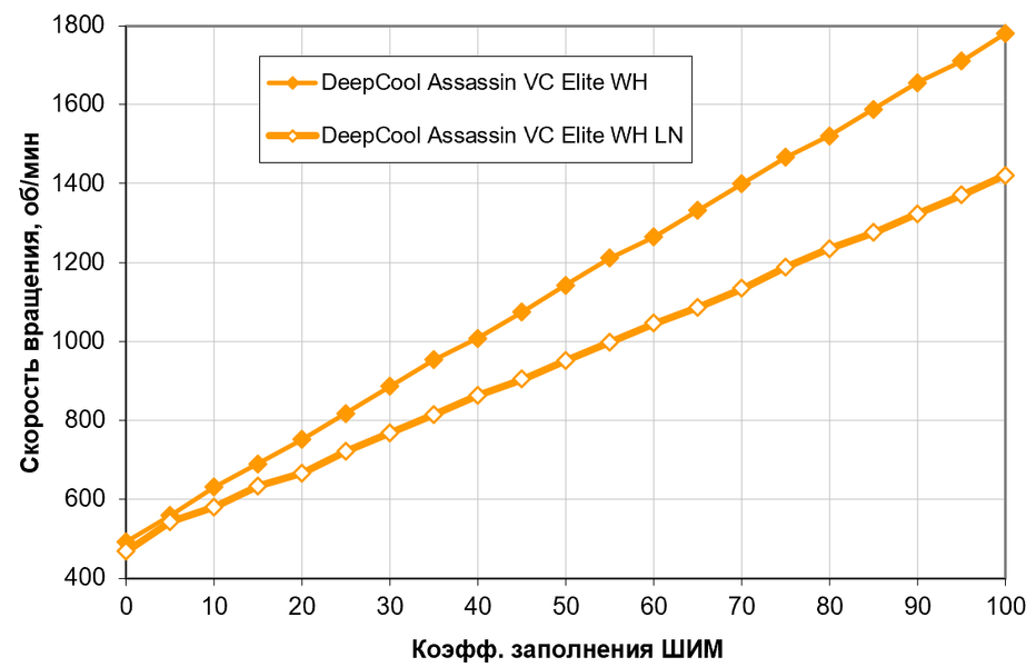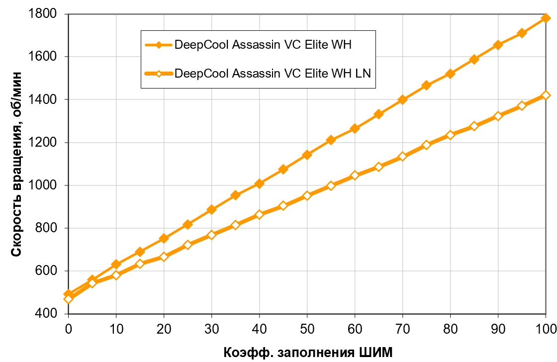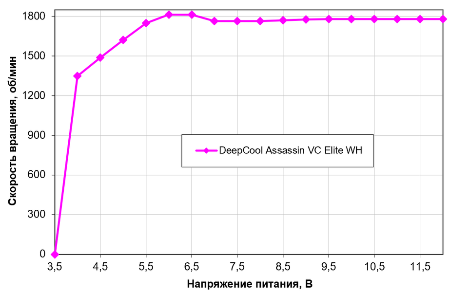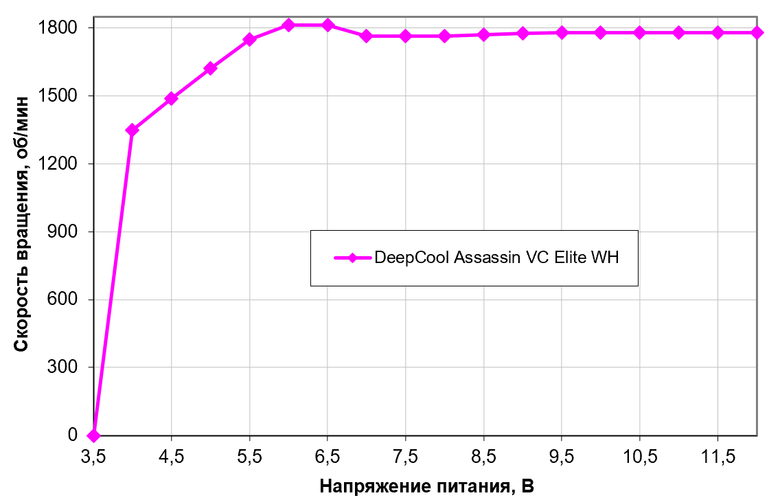 Но это единственное, для чего к ней стоит прибегать, поскольку скорость вращения вентиляторов стабилизирована в широком диапазоне напряжений. Ниже 6 В ее можно незначительно понизить, а отключаются вентиляторы на 3,6 В (включаются обратно — на 3,9 В). Вентиляторы допустимо подключать к источнику с напряжением 5 В, но, как нам, кажется практического смысла это лишено. Что заслуживает внимания — в DeepCool Assassin IV VC Vision стабилизированный участок представляет собой идеальную полку, а в DeepCool Assassin VC Elite WH скорость вращения немного колеблется. Но это не стоит считать различием моделей — скорее, как раз следствие тех самых производственных допусков, влияющих на каждый конкретный экземпляр.