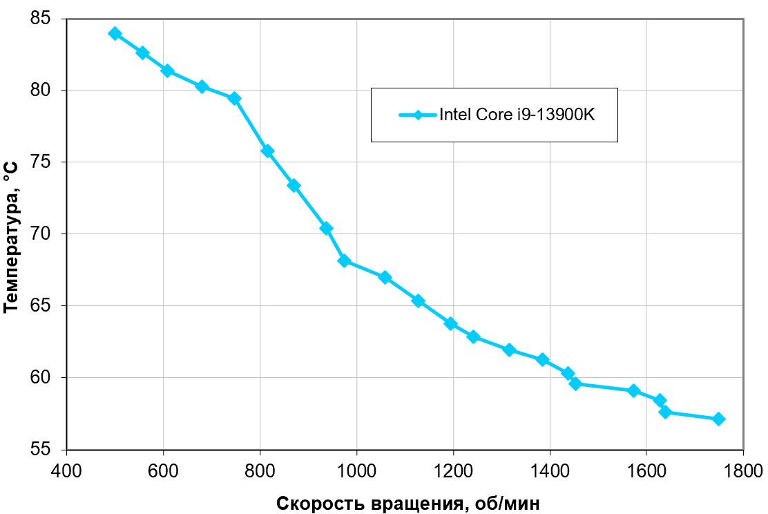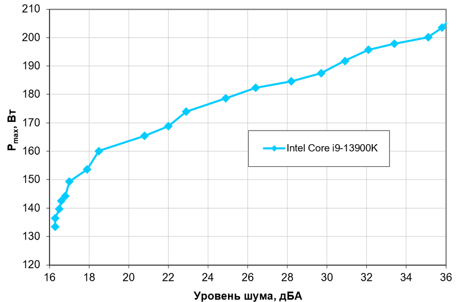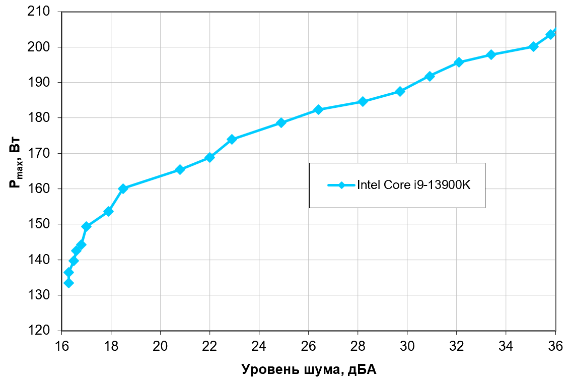 Приняв 25 дБА за критерий условной бесшумности, получим примерную максимальную мощность процессоров типа Intel Core i9-13900K, соответствующих этому уровню, это 179 Вт. Для ровного счета можно считать, что 180 Вт, а если не обращать особого внимания на уровень шума, то потолок можно поднять примерно до 200 Вт. Еще раз уточним: это в жестких условиях обдува радиатора нагретым до 44 градусов воздухом и нежелании видеть более 80 градусов на ядрах процессора. При снижении температуры воздуха указанные пределы для бесшумной работы и максимальной мощности возрастают.