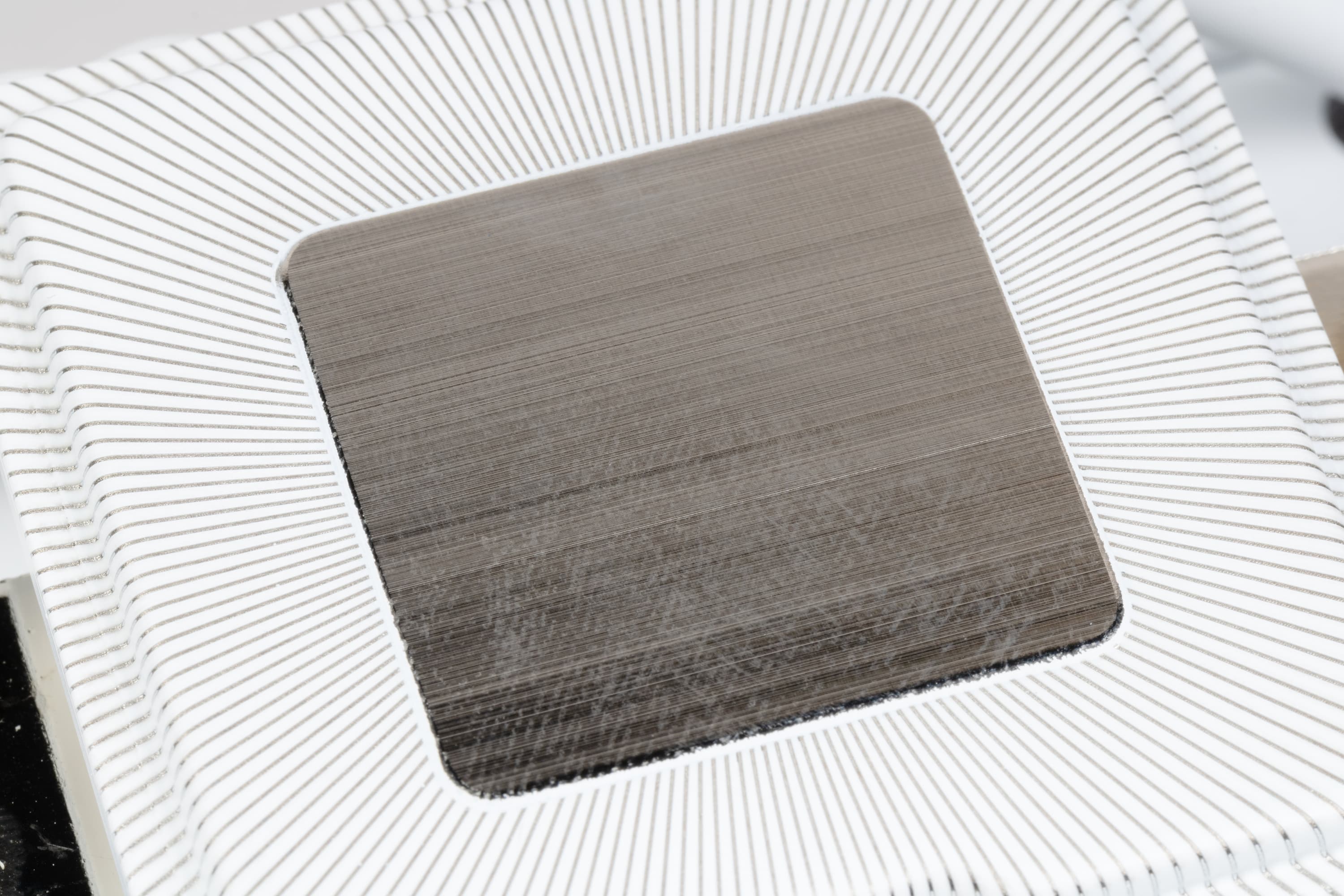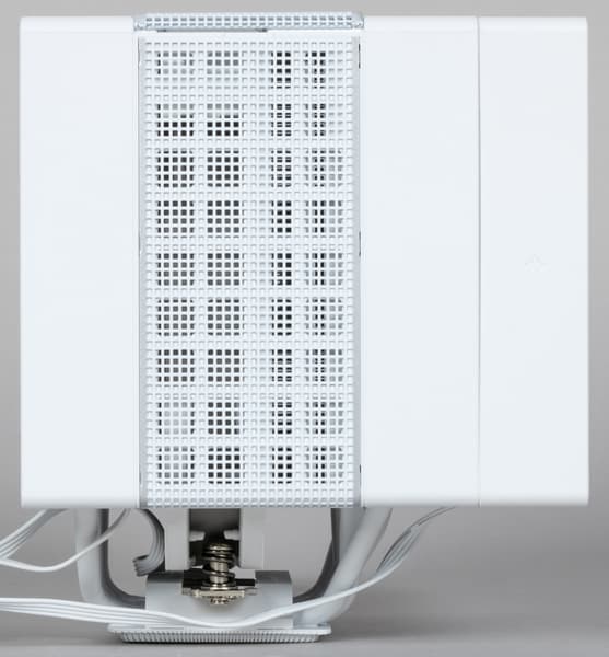Кулер оснащен вынесенным двойным радиатором, к которому тепло от теплосъемника передается по семи тепловым трубкам диаметром 6 мм. Трубки и нижняя часть теплосъемника медные. Трубки, нерабочая поверхность теплосъемника и пластины радиатора и часть деталей крепежа имеют белое полуматовое лакокрасочное покрытие. Верхняя часть теплосъемника изготовлена из алюминиевого сплава. Трубки к теплосъемнику припаяны, а вот пластины обходятся без пайки — хотя при такой цене можно было бы уже об этом и позаботиться. Подошва теплосъемника продолжает выглядеть непривычно, хотя сталкиваемся мы с такой уже второй раз.