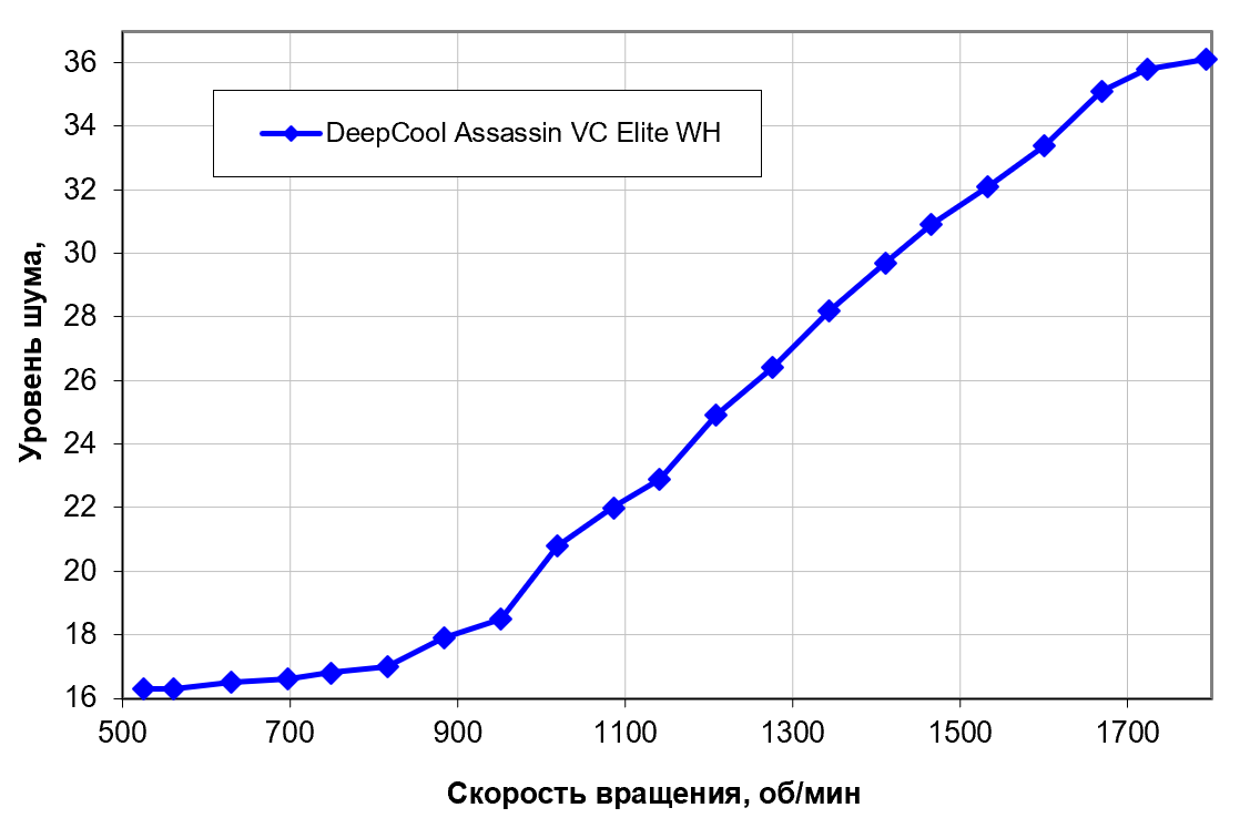 Зависит, конечно, от индивидуальных особенностей и других факторов, но в случае кулеров где-то от 40 дБА и выше шум с нашей точки зрения очень высокий для настольной системы, от 35 до 40 дБА уровень шума относится к разряду терпимых, ниже 35 дБА шум от системы охлаждения не будет сильно выделяться на фоне типичных небесшумных компонентов ПК — вентиляторов корпусных, на блоке питания, на видеокарте, а также жестких дисков, а где-то ниже 25 дБА кулер можно назвать условно бесшумным. Фоновый уровень был равен 16,1 дБА (условное значение, которое показывает шумомер). К нему мы стабильно пришли бы при отключении вентиляторов (естественно), но несложно заметить, что это не обязательно — работа на минимальных оборотах обеспечивает шум, практически не отличимый от фонового без приборов. А вот на максимуме вентиляторы слишком тихими не назовешь, но и слишком громкими — тоже. И, кстати, нашелся повод похвалить теперь уже наш DeepCool Assassin VC Elite WH — максимальный шум на пару дБА ниже, чем у (нашего же) Assassin IV VC Vision. Понятно, что ни тот, ни другой на максимальных оборотах большого смысла эксплуатировать нет, но вот тут уже мелкие различия сыграли в сторону новой модели.