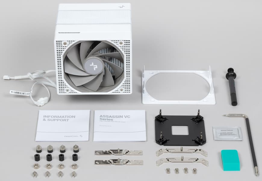 Но прямо на старте очевидно, что большим различиям между разными VC взяться неоткуда — фактически меняется лишь комплект поставки, но не сам кулер. Тем не менее, мы решили протестировать новую модификацию, даже не ожидая найти в ней что-то новое. Интересным тут является само по себе сравнение — как уже было как-то сказано, по-хорошему иногда стоило бы тестировать и вовсе пару экземпляров одной модели, поскольку, когда дело доходит до механики, невозможно говорить о какой-то идеальной точности и повторяемости результатов. Но такие тестирования — роскошь: разных моделей много, а нас... не очень. А тут и практически такой эксперимент — и формально другая модель. Причем есть у нас ощущение, что Elite рискует стать более популярным, чем Vision — именно потому, что информационные панели нужны не всем, а вот желание немного сэкономить, напротив, любому человеку свойственно. Да и особых потерь во внешнем виде всё равно нет — все кулеры линейки Assassin IV оригинальны, так что будут хорошо смотреться и в корпусе с окном (кои постепенно заполоняют полки магазинов, давно уже перестав быть экзотикой). Особенно это касается кулеров белого цвета, а для DeepCool Assassin VC Elite пока доступен только такой. Будет ли черная модификация — пока не знаем. Но, кстати, не удивимся, если изменение цвета немного скажется и на результатах — в первую очередь из-за того, что в вентиляторах будет использоваться немного другие материалы. Да и скорости их вращения в спецификациях указываются с допуском в ±10% — но это верно и для одной модели, где с житейской точки зрения все экземпляры должны быть в точности одинаковы.