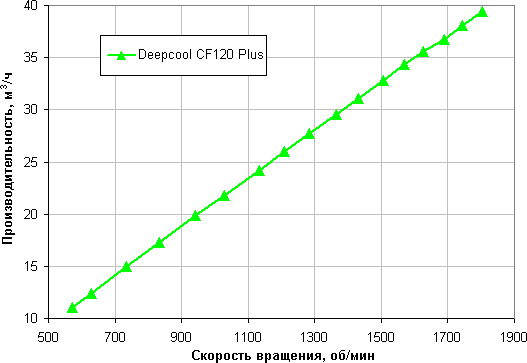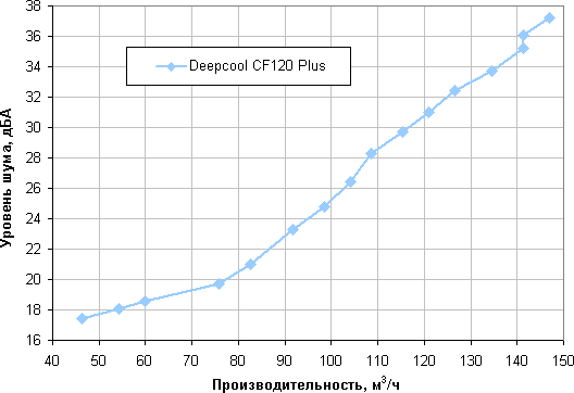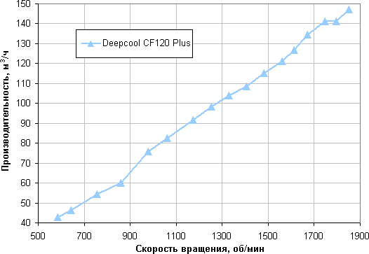 Напомним, что в этом тесте мы создаем некое аэродинамическое сопротивление (весь поток воздуха проходит через крыльчатку анемометра), поэтому полученные значения отличаются в меньшую сторону от максимальной производительности в характеристиках вентилятора, так как последняя приводится для нулевого статического давления (отсутствует аэродинамическое сопротивление).
