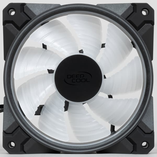 Вентиляторы Deepcool CF 120 Plus из данного комплекта по соотношению производительности и шума занимают позицию, близкую к лидерам среди протестированных по текущей методике моделей. При этом они немного лучше работают в условиях низкого сопротивления воздушному потоку. В целом вентиляторы получились весьма универсальные, они могут работать тихо, сохраняя достаточно высокую производительность, или на высоких оборотах, создавая довольно высокое давление и поток. Особенностью Deepcool CF 120 Plus являются две зоны подсветки с 18 независимо управляемыми RGB-светодиодами. Управлять работой подсветки можно как с помощью прилагаемого кнопочного контроллера, так и штатными средствами материнской платы или другого контроллера, оснащенного стандартным трехконтактным разъемом для адресуемой подсветки. Если отключить центральную зону, то подсветка будет совсем неназойливой.