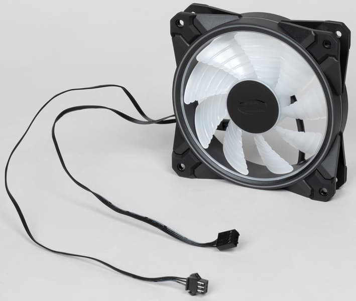 Рамка вентилятора составная: элементы из прочного черного пластика перемежаются со вставками из белого полупрозрачного пластика. Из такого же материала изготовлена крыльчатка вентилятора. Полупрозрачные элементы прикрывают расположенные по кругу многоцветные светодиоды, которые образуют две зоны подсветки: рамка и крыльчатка. Всего используется 18 независимо управляемых адресуемых RGB-светодиода на одном вентиляторе.
