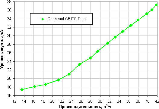 В современных условиях и в потребительском сегменте эргономика, как правило, имеет приоритет над производительностью, поэтому зафиксируем уровень шума на значении 25 дБА. Теперь для оценки вентиляторов достаточно сравнивать их производительность при данном уровне шума.