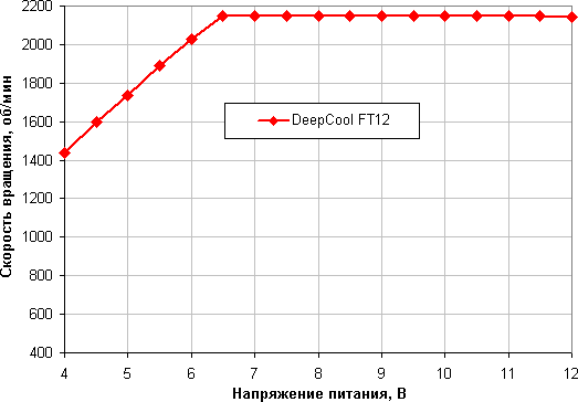 Характер данной зависимости (как и последующие тесты) показывает, что в этом вентиляторе используется система стабилизации скорости вращения, задаваемой с помощью КЗ ШИМ. Скорость вращения поддерживается постоянной в некотором диапазоне нагрузки и до определенной степени снижения напряжения. Без нагрузки скорость начинает снижаться только ниже 6,5 В.