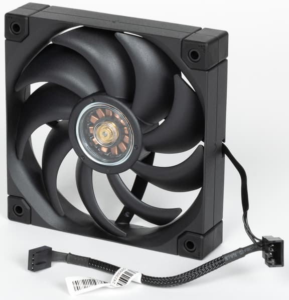Кабель питания вентилятора от самого вентилятора до проходного разъема просто плоский (7 см), а от этого разъема до основного разъема заключен в плетеную оболочку (еще 13 см). Удлинитель питания (40 см) имеет плоский кабель. Вентилятор поддерживает управление с помощью ШИМ.