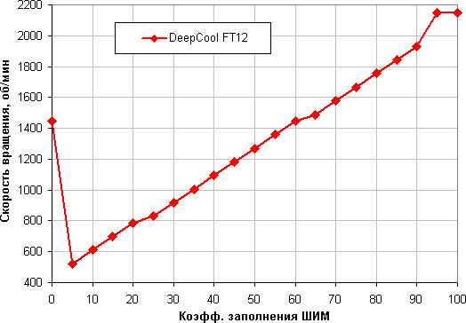 Диапазон регулировки довольно широкий — при изменении КЗ от 5% до 95% скорость вращения растет от примерно 520 до 2150 об/мин. При КЗ 0% скорость снова возрастает до примерно 1450 об/мин. Это может иметь значение, если пользователь хочет создать гибридную систему охлаждения, которая при низкой нагрузке работает полностью или частично в пассивном режиме.