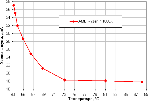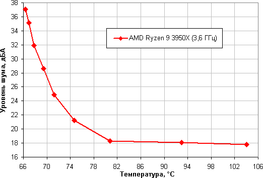 Зависимость уровня шума от температуры процессора при полной загрузке: