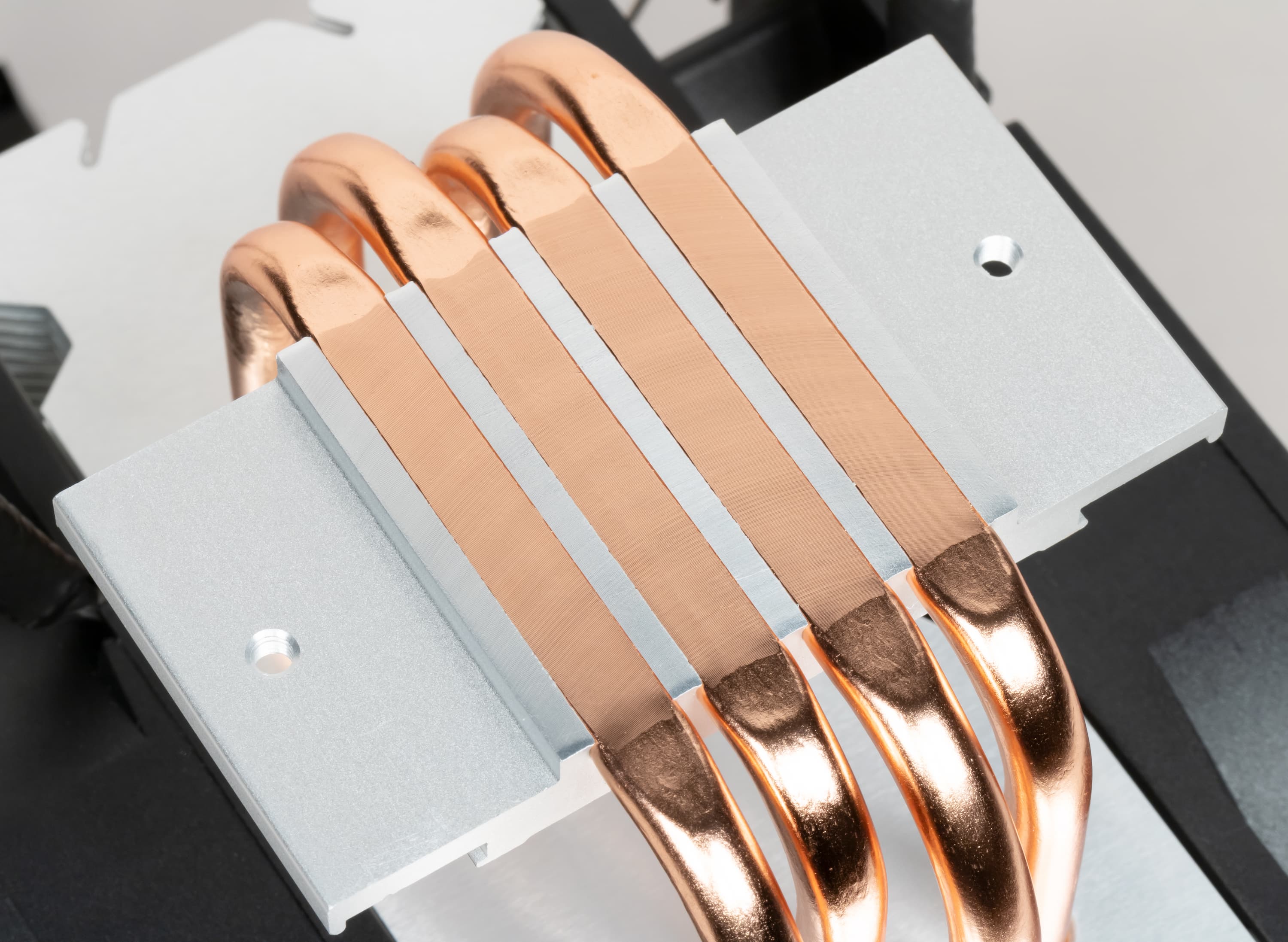 Кулер оснащен вынесенным радиатором, к которому тепло от подошвы передается по четырем тепловым трубкам. Трубки, разумеется, медные. У подошвы теплосъемника трубки сплющены и впрессованы в толстую алюминиевую пластину. Прилегающие к процессору плоскости трубок сошлифованы и слегка отполированы. На подошве теплосъемника между трубками и ребрами подошвы есть едва выраженные канавки. Рабочая плоскость теплосъемника практически идеально плоская, до установки она защищена пластиковой пленкой.