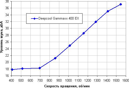 Зависит, конечно, от индивидуальных особенностей и других факторов, но в случае кулеров где-то от 40 дБА и выше шум с нашей точки зрения очень высокий для настольной системы, от 35 до 40 дБА уровень шума относится к разряду терпимых, ниже 35 дБА шум от системы охлаждения не будет сильно выделяться на фоне типичных небесшумных компонентов ПК — вентиляторов корпусных, на блоке питания, на видеокарте, а также жестких дисков, а где-то ниже 25 дБА кулер можно назвать условно бесшумным. Фоновый уровень был равен 17,4 дБА (условное значение, которое показывает шумомер). Кулер Deepcool Gammaxx 400 EX можно считать относительно тихим устройством. Правда, на самых высоких оборотах от вытяжного вентилятора слышно стрекотание, возникающее из-за того, что лопасти вентилятора вращаются очень близко от пластин радиатора, но уже при небольшом снижении скорости вращения стрекотание исчезает.