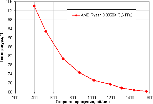 Зависимость температуры процессора при его полной загрузке от скорости вращения вентиляторов: