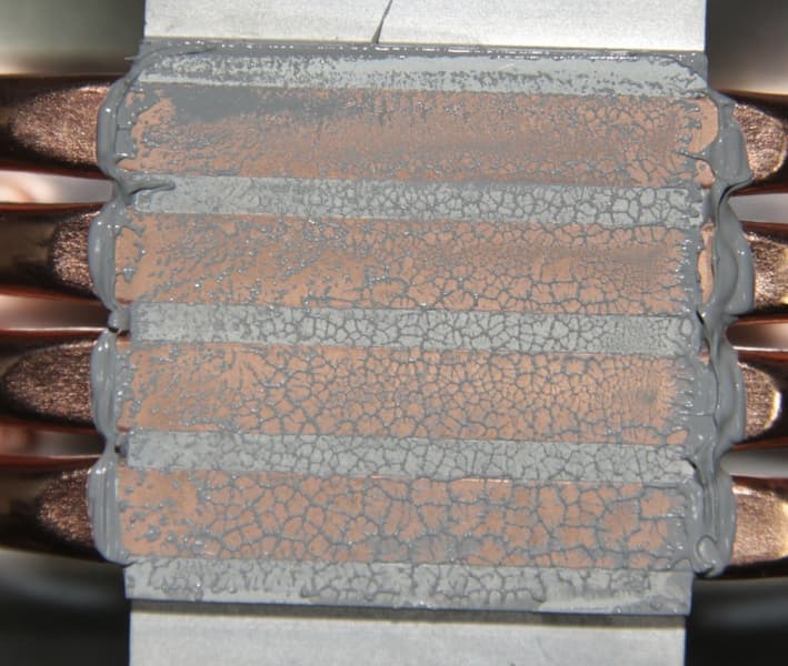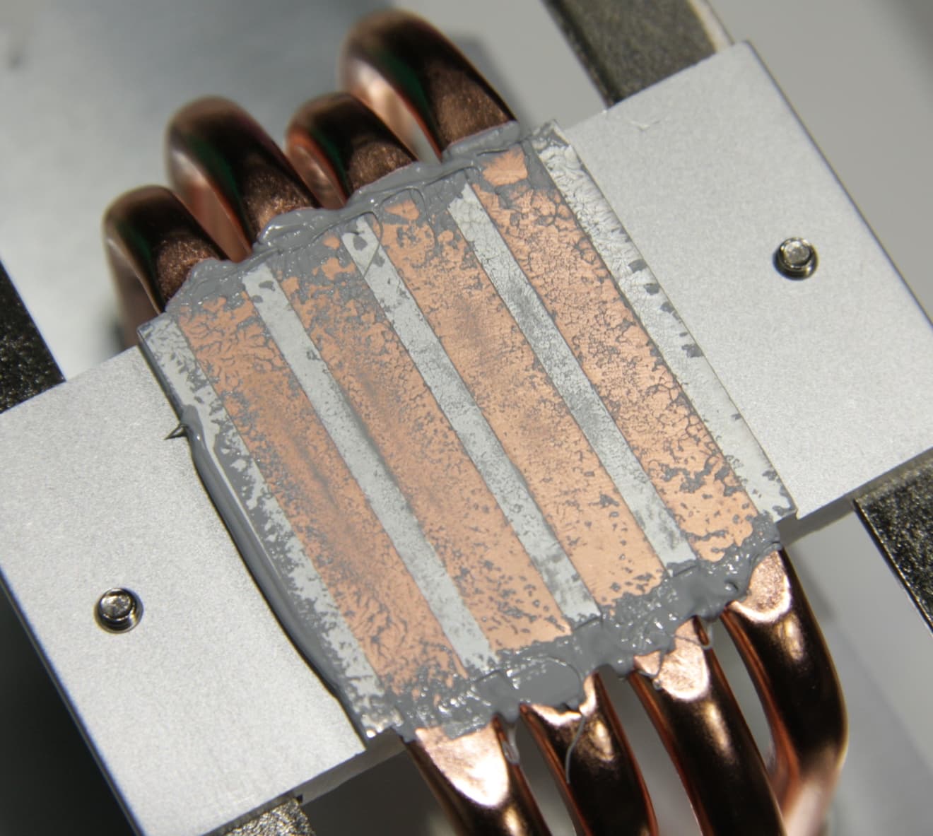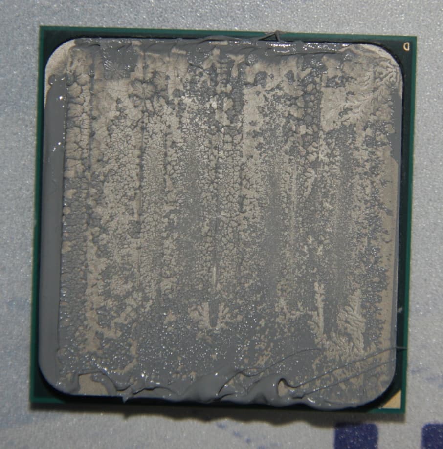 Видно, что термопаста распределилась тонким слоем почти по всей плоскости крышки процессора, а ее избыток выдавился по краям. Пятно плотного контакта большое.