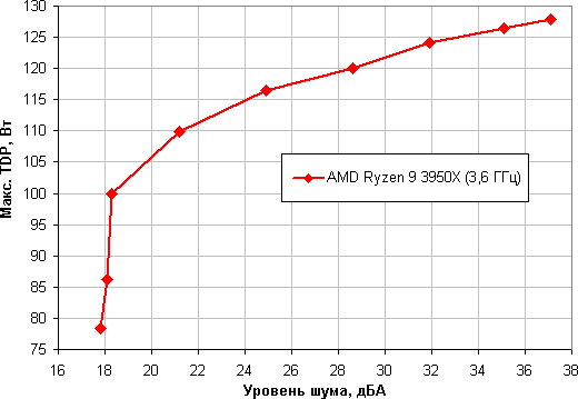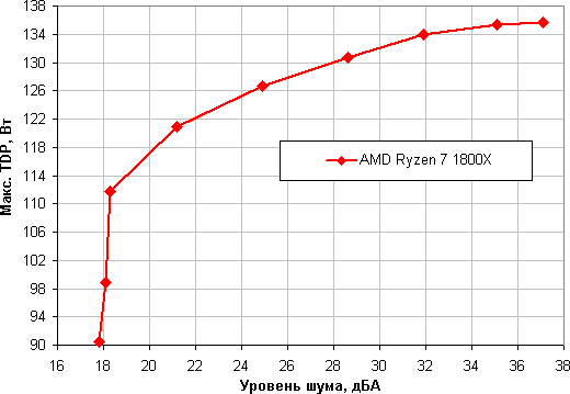Ограничившись указанными выше условиями, построим зависимость реальной максимальной мощности (обозначенной как Макс. TDP), потребляемой процессором, от уровня шума: