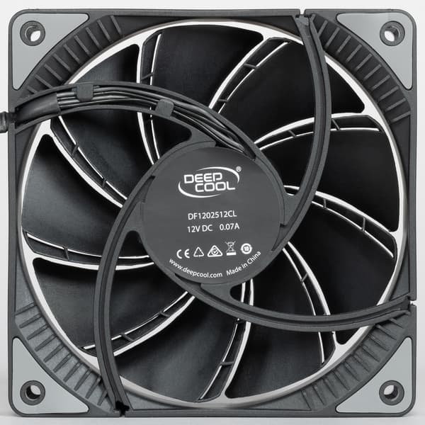 Типоразмер комплектных вентиляторов 120 мм. Высота рамки 25 мм. Лопасти крыльчатки имеют особую геометрию, производитель называет их двойными. В проушины в углах рамки вентилятора вклеены виброизолирующие накладки из резины средней жесткости. В несжатом состоянии накладки выступают примерно на 0,5 мм относительно габаритов рамки. По замыслу разработчиков, это должно обеспечивать виброразвязку вентилятора от места крепления. Однако если прикинуть соотношение массы вентилятора к жесткости накладок, то становится понятно, что резонансная частота конструкции получается очень высокой, то есть практически никакой эффективной виброразвязки быть не может. К тому же крепежные скобки фиксируются непосредственно за рамку вентилятора и за пластины радиатора, что не оставляет никакого шанса на хоть какую-то виброразвязку. Маркировка на вентиляторе позволяет определить, что используется модель DF1202512CL.