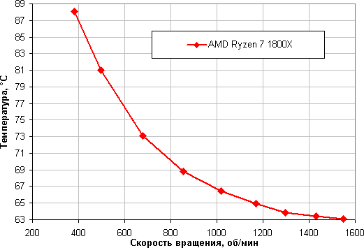 В этом тесте наш процессор AMD Ryzen 7 1800X не перегревается даже на минимальных оборотах вентилятора, достигаемых при регулировке с помощью ШИМ. Можно даже дополнительно снизить напряжение до 10 В (что даст примерно 380 об/мин), но при снижении напряжения до 8 В система уже выключается из-за перегрева.