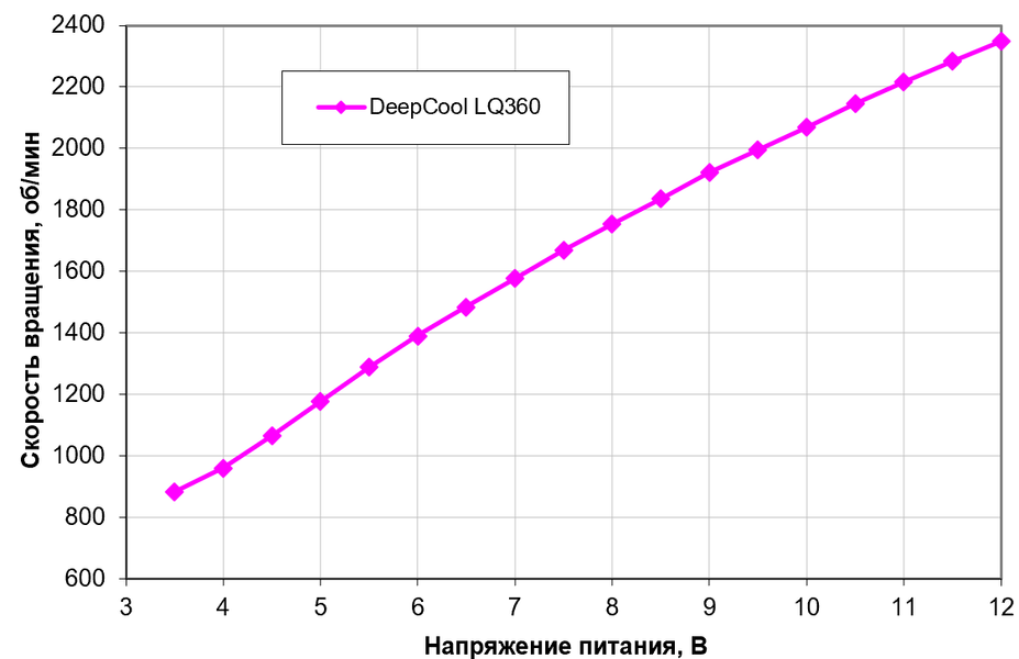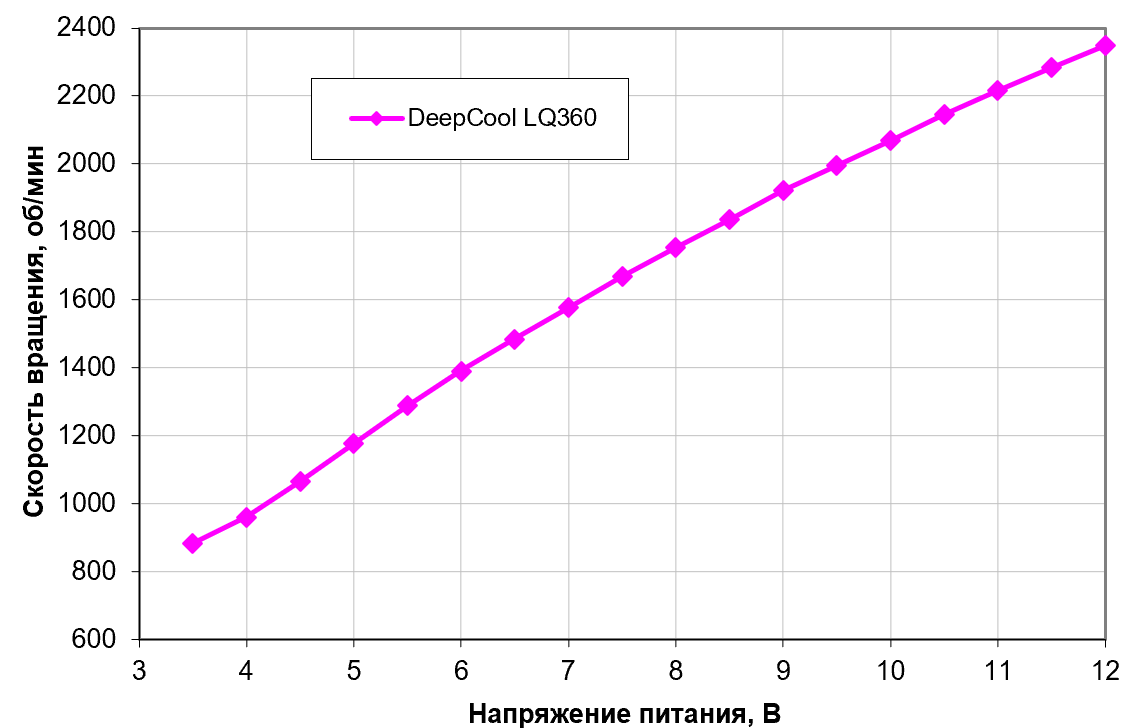 В данном тесте все ядра процессора Intel Core i9-13900K работали на фиксированной частоте 4,1 ГГц. В случае тестов под нагрузкой и при измерении уровня шума скорость вращения вентиляторов изменялась с помощью ШИМ при изменении КЗ в диапазоне от 100% до 15% с шагом в 5%. Помпа работала от 12 В.