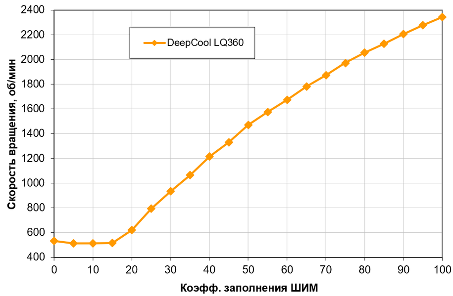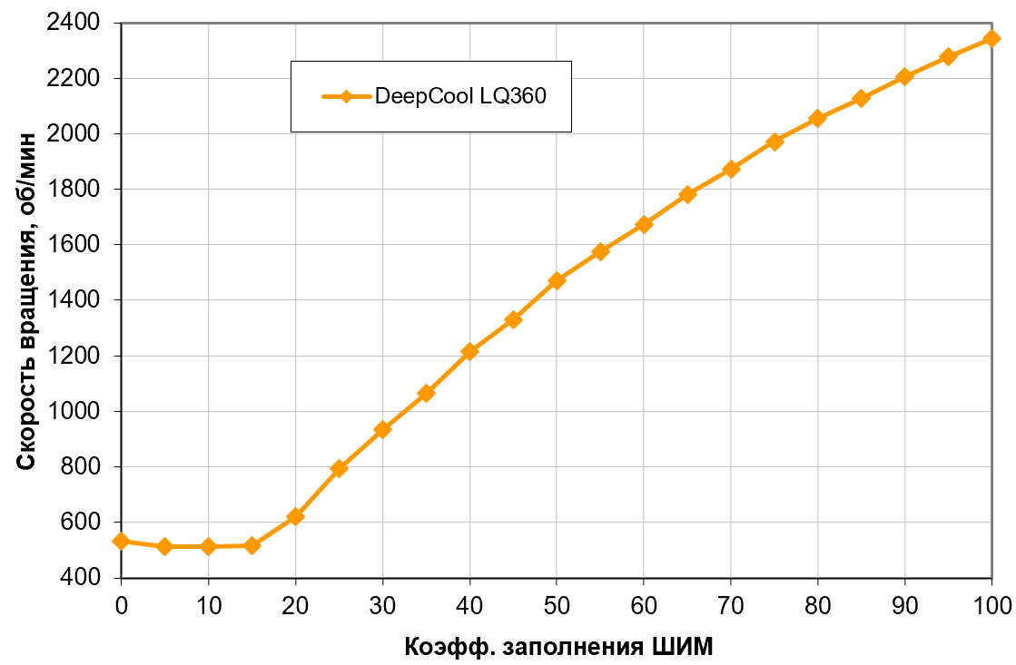 Хороший результат: монотонный рост скорости вращения при изменении коэффициента заполнения от 15% до 100%, диапазон регулировки скорости вращения широкий. При снижении коэффициента заполнения (КЗ) до 0% вентиляторы не останавливаются, а стабилизируются примерно на 510 об/мин (минимальные по паспорту, напомним, 600 об/мин). Это может иметь значение при желании создать гибридную систему охлаждения, при низкой нагрузке работающую (полностью или частично) в пассивном режиме.