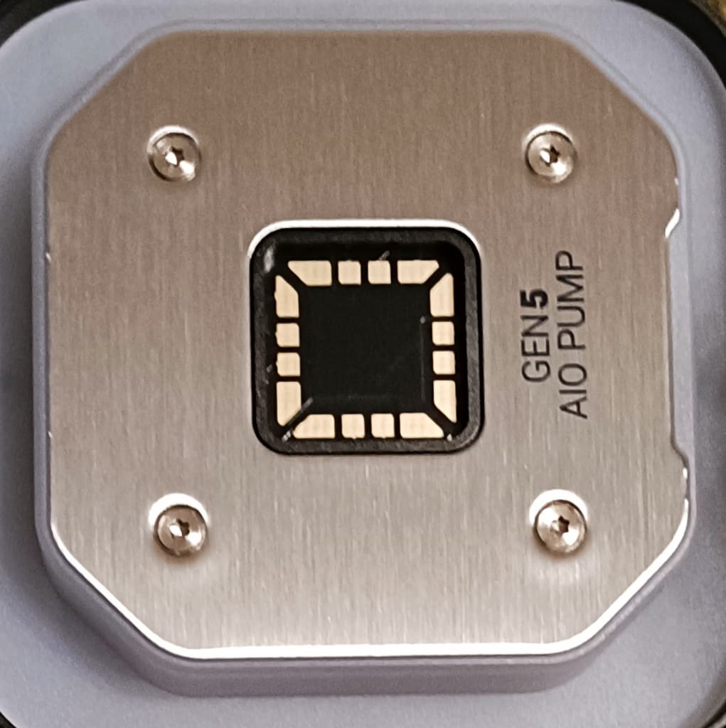 Габариты этой пластины — 54×54 мм, а внутренняя часть, ограниченная отверстиями под винты, имеет размеры примерно 40×40 мм. Ее центральную часть изначально занимает нанесенная тонким слоем термопаста.