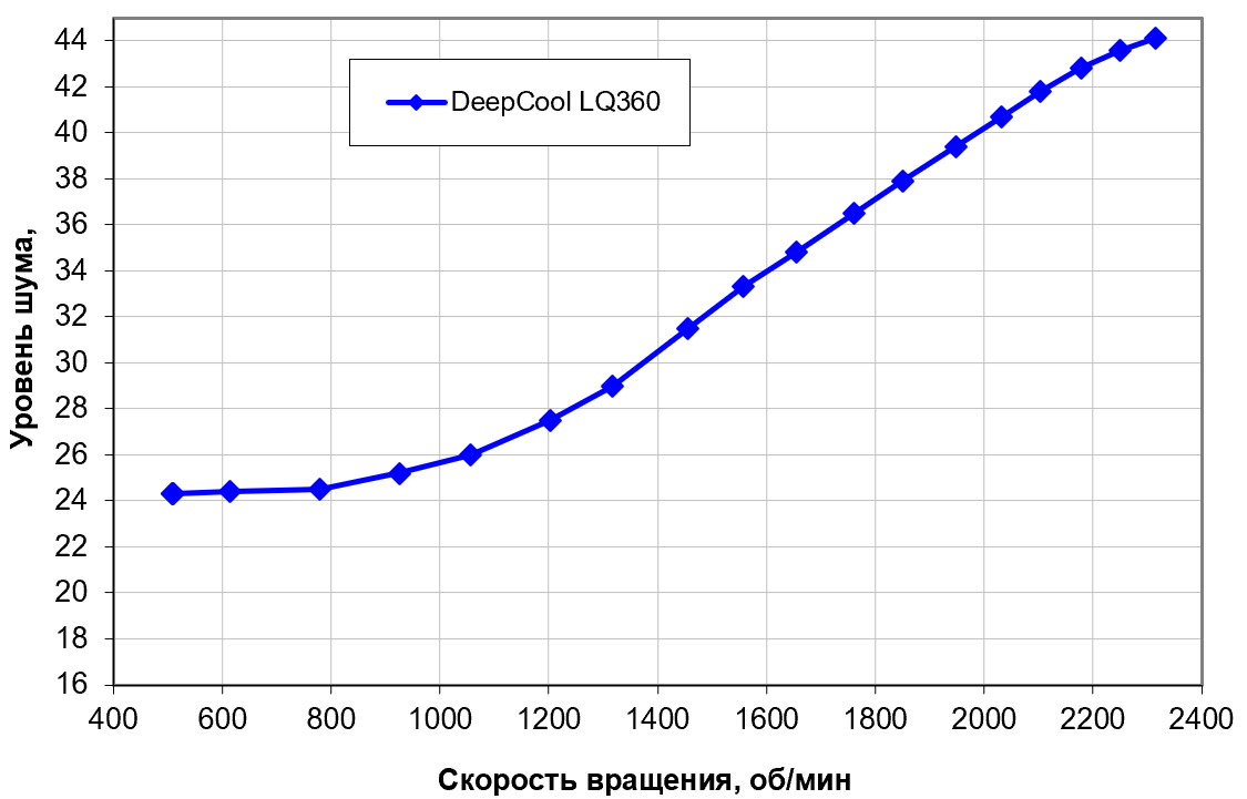 Уровень шума меняется в широком диапазоне. Зависит, конечно, от индивидуальных особенностей и других факторов, но где-то от 40 дБА и выше шум, с нашей точки зрения, очень высокий для настольной системы; от 35 до 40 дБА уровень шума относится к разряду терпимых; ниже 35 дБА шум от системы охлаждения не будет сильно выделяться на фоне типичных небесшумных компонентов ПК — корпусных вентиляторов, вентиляторов на блоке питания и на видеокарте, а также жестких дисков (при их наличии); а где-то ниже 25 дБА кулер можно назвать условно бесшумным. Фоновый уровень был равен 16,8 дБА (условное значение, которое показывает шумомер). Помпа работает довольно громко — выше 24 дБА, и снизить скорость ее вращения затруднительно. Именно это и определяет минимальный шум всей системы — вентиляторы ниже 800 об/мин на нем уже практически не сказываются.
