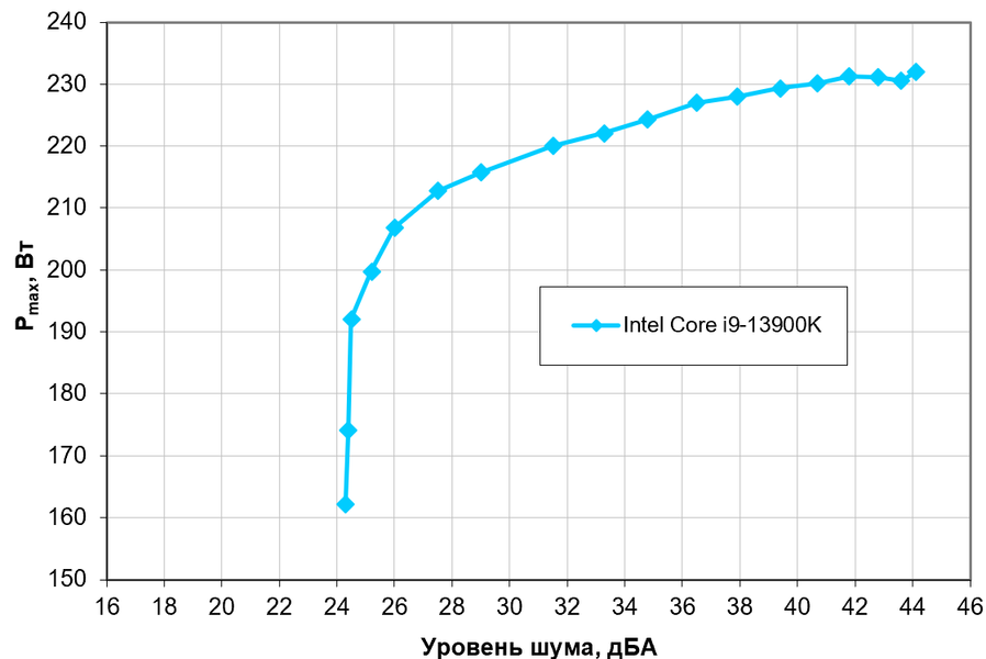 Приняв 25 дБА за критерий условной бесшумности, получим примерную максимальную мощность процессоров, соответствующих этому уровню. С небольшой натяжкой это 200 Вт для процессора Intel Core i9-13900K, хотя лучше ориентироваться на 190 Вт. Если не обращать внимания на уровень шума, то пределы мощности можно увеличить примерно до 230 Вт. Еще раз уточним: это в жестких условиях обдува радиатора нагретым до 44 градусов воздухом. При снижении температуры воздуха и/или увеличении максимально допустимой температуры процессора (для него допустимо 100 °C) указанные пределы мощности для бесшумной работы и максимальной мощности радикально возрастают.