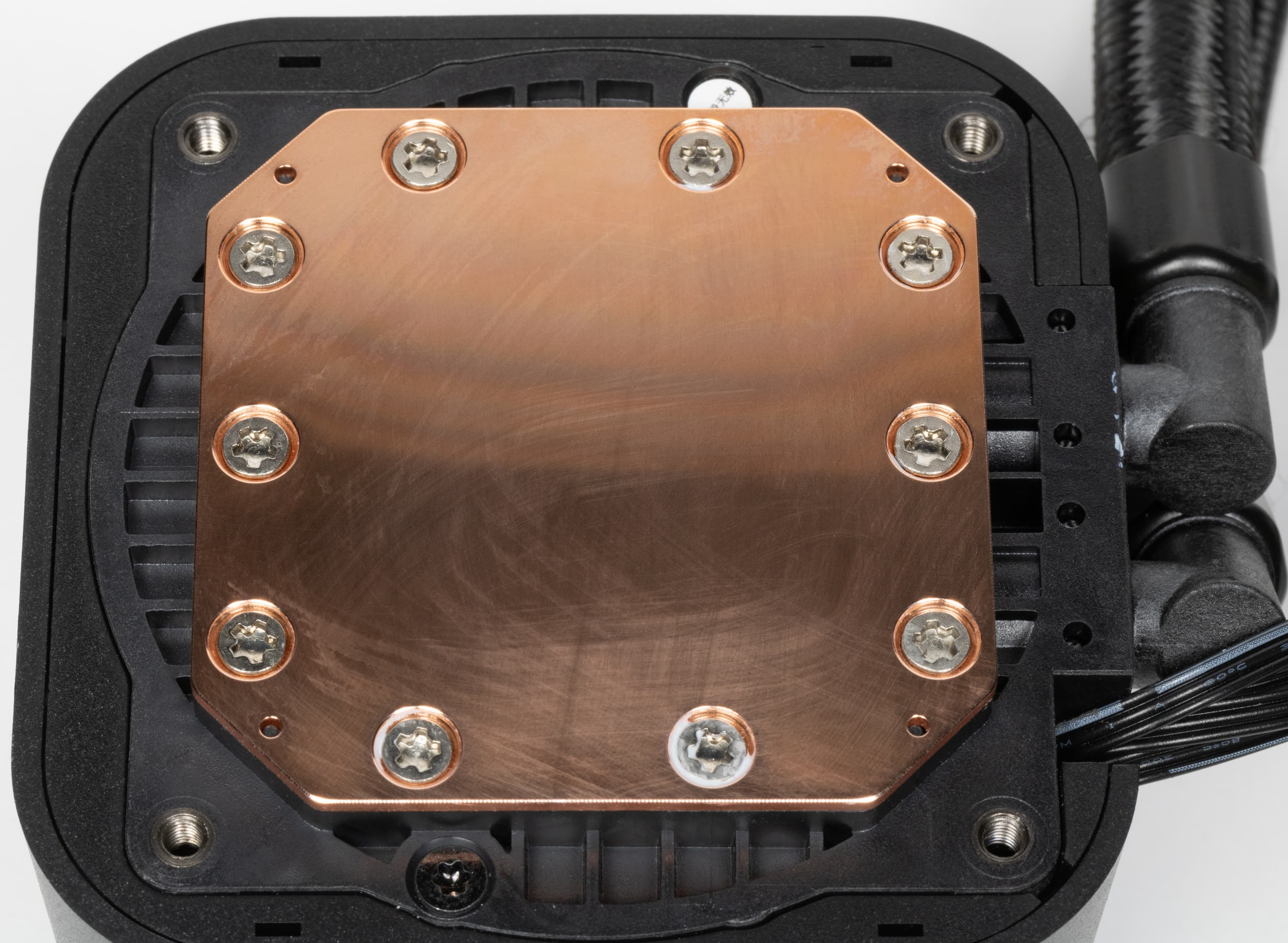 Система герметичная, заправлена, готова к использованию. Помпа интегрирована в один блок с теплосъемником. Подошвой теплосъемника, непосредственно прилегающей к крышке процессора, служит медная пластина. Ее внешняя поверхность ровная, шлифованная и слегка полированная. К центру она выпуклая с перепадом порядка 0,2-0,3 мм.