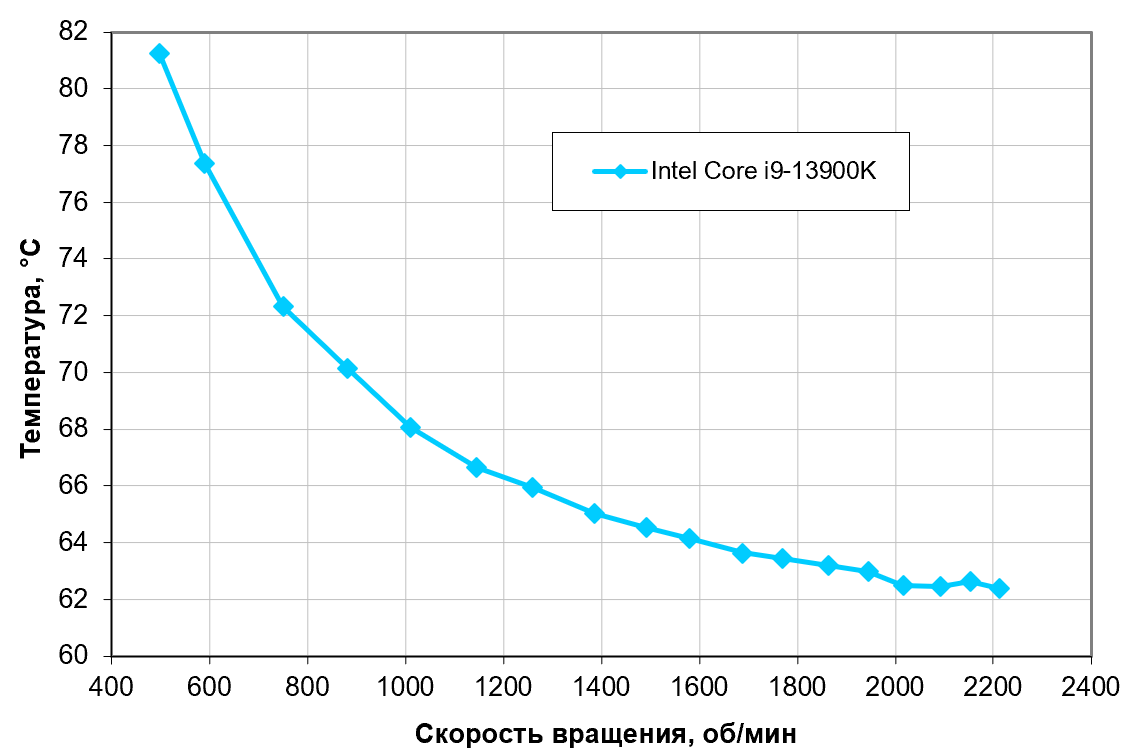 В этом тесте процессор Intel Core i9-13900K не перегревается (при 24 °C окружающего воздуха) на оборотах вентиляторов, достигаемых при снижении КЗ до 15%, что соответствует примерно 500 об/мин. При этом максимальное потребление, по данным мониторинга, составило порядка 219 Вт, а по разъемам для питания процессора — 258 Вт. Напомним, что базовая мощность этого процессора в полностью штатном режиме составляет всего 125 Вт, а максимальная кратковременная (турбо-лимит) — 253 Вт.