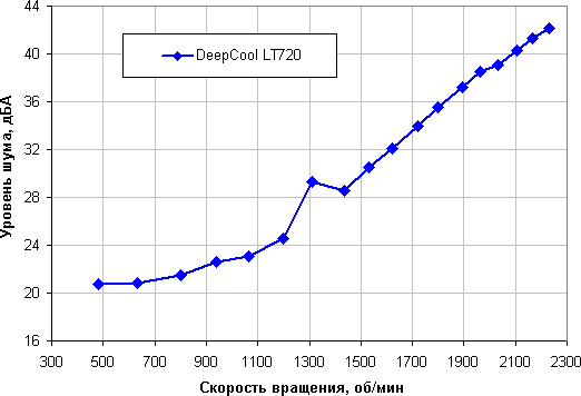 Уровень шума этой системы охлаждения меняется в широком диапазоне. Зависит, конечно, от индивидуальных особенностей и других факторов, но где-то от 40 дБА и выше шум, с нашей точки зрения, очень высокий для настольной системы; от 35 до 40 дБА уровень шума относится к разряду терпимых; ниже 35 дБА шум от системы охлаждения не будет сильно выделяться на фоне типичных небесшумных компонентов ПК — корпусных вентиляторов, вентиляторов на блоке питания и на видеокарте, а также жестких дисков; а где-то ниже 25 дБА кулер можно назвать условно бесшумным. Фоновый уровень был равен 16,0 дБА (условное значение, которое показывает шумомер). В районе 1300 об/мин (КЗ = 45%) может появляться резонансное гудение вентиляторов, но при изменении КЗ в большую или меньшую сторону гудение исчезает, да и громкость его невелика. На спектрограмме ниже пик на 250 Гц как раз соответствует этому гудению.