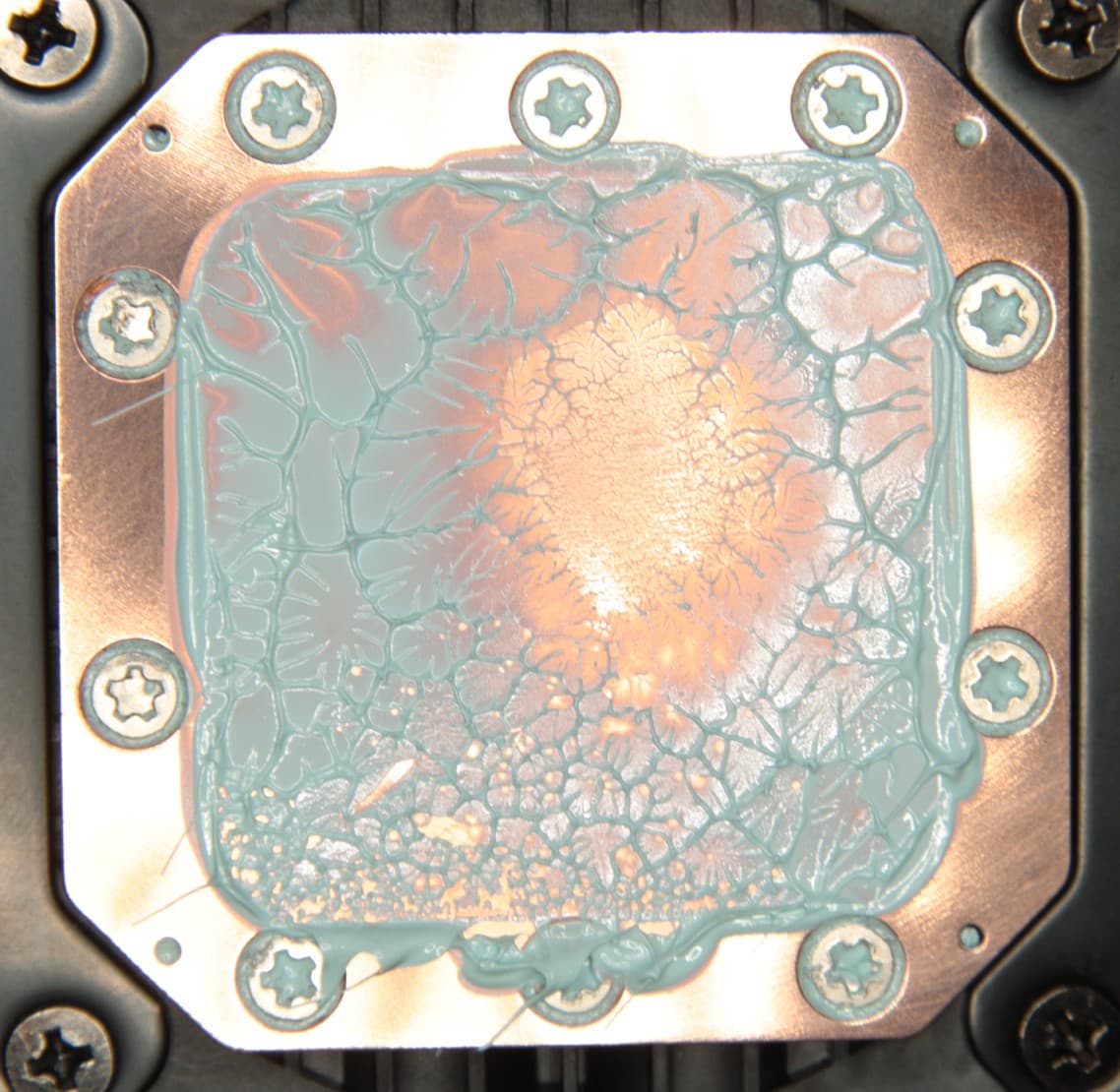Запаса для ее восстановления в комплекте поставки, к сожалению, нет. В тестах использовалась не менее качественная термопаста другого производителя. Забегая вперед, продемонстрируем распределение термопасты после завершения всех тестов. На процессоре Intel Core i9-7980XE: