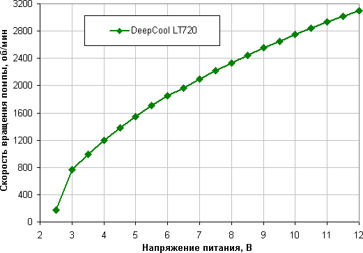 В случае тестов под нагрузкой и при измерении уровня шума скорость вращения вентиляторов изменялась с помощью ШИМ при изменении КЗ в диапазоне от 100% до 15% с шагом в 5%. Помпа работала от 12 В.