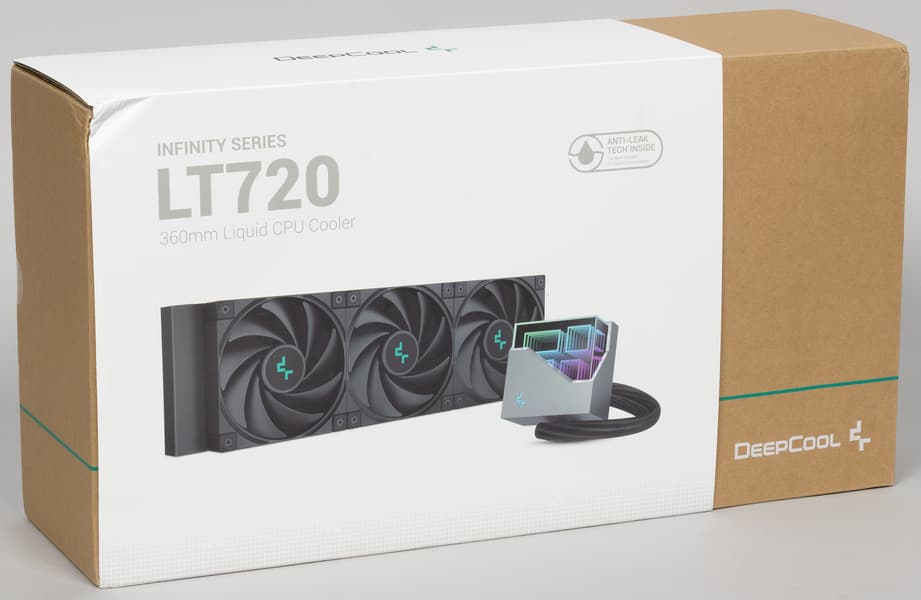 Поставляется система жидкостного охлаждения DeepCool LT720 в коробке из среднего по толщине гофрированного картона. Поверх коробки надет шубер (суперобложка), на котором в цвете изображен сам продукт, а также перечислены основные технические характеристики, приведено описание системы антипротечки (встроенный в радиатор гидроамортизатор) и другая дополнительная информация. Почти все надписи на английском языке и только отсылка на сайт компании за дополнительной информацией продублирована на нескольких языках, включая русский. Для защиты и распределения деталей используются форма из папье-маше, прокладки из вспененного полиэтилена и пластиковые пакеты. Пакеты с аксессуарами убраны в картонную коробочку, там же в картонном конверте находится документация. Подошва теплосъемника и термопаста на ней защищены фигурной накладкой из прозрачного пластика.