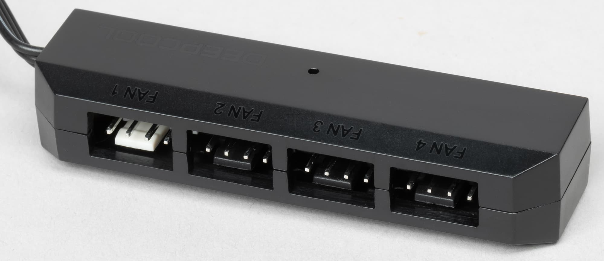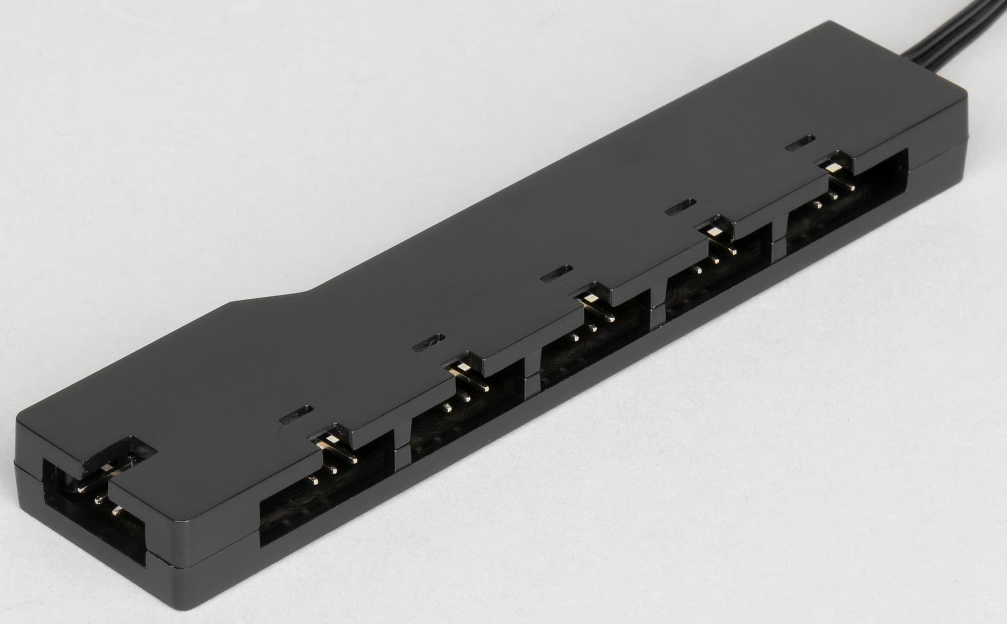 Разветвитель питания вентиляторов представляет собой небольшую коробочку из черного пластика. Ее можно закрепить в корпусе ПК, использовав полоску с клейким слоем снизу.
