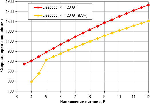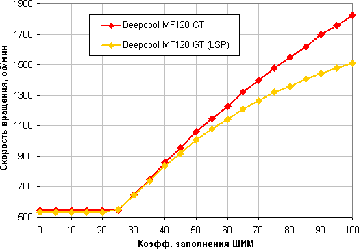 Диапазон регулировки весьма широкий — от 25% до 100% с плавным ростом скорости вращения. При КЗ 0% вентилятор продолжает вращаться на постоянной минимальной скорости. Это может иметь значение, если пользователь хочет создать гибридную систему охлаждения, которая при низкой нагрузке работает полностью или частично в пассивном режиме. Вставка LSP оказывает существенное влияние только на высоких скоростях.