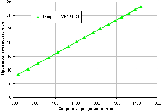 Напомним, что в этом тесте мы создаем некое аэродинамическое сопротивление (весь поток воздуха проходит через крыльчатку анемометра), поэтому полученные значения отличаются в меньшую сторону от максимальной производительности в характеристиках вентилятора, так как последняя приводится для нулевого статического давления (отсутствует аэродинамическое сопротивление).