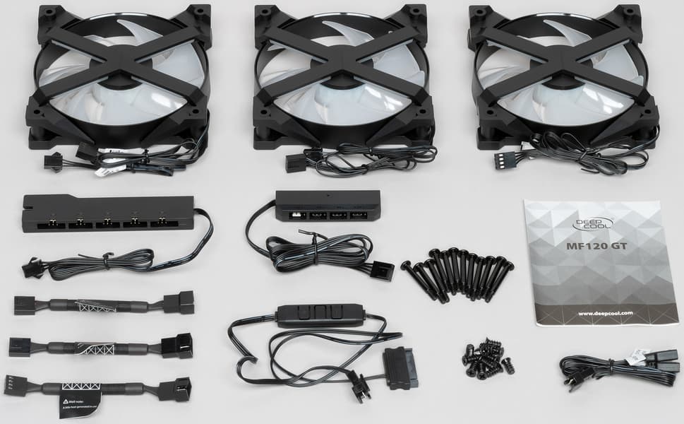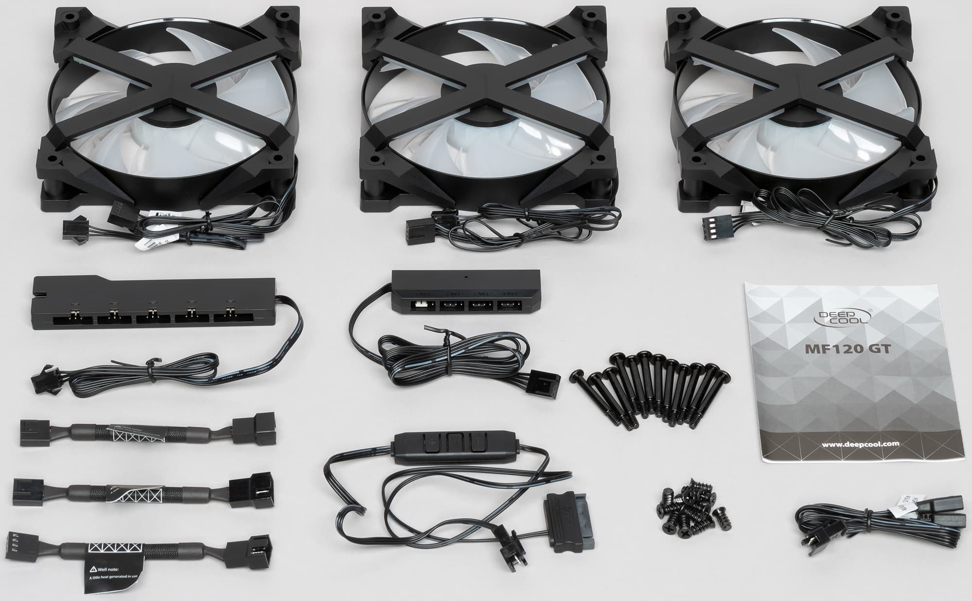Вентиляторы Deepcool MF120 GT из данного комплекта по соотношению производительности и шума проигрывают большинству вентиляторов, среди протестированных по текущей методике. При этом они немного лучше работают в условиях низкого сопротивления воздушному потоку. Определяющим фактором при выборе Deepcool MF120 GT будет, пожалуй, их необычный дизайн и красочная, но при этом неназойливая подсветка. Отметим, что набор отличается хорошей комплектацией — в него входят нужные разветвители, контроллер подсветки, специальные винты для крепления к радиаторам СЖО и даже вставки с резисторами, снижающими скорость вращения вентиляторов и шум от них.