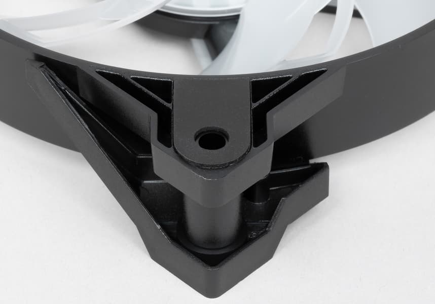 На проушины в углах рамки вентилятора с одной стороны наклеены виброизолирующие резиновые накладки. В несжатом состоянии они выступают примерно на 0,75 мм относительно плоскости рамки. По замыслу разработчиков, это должно обеспечивать виброразвязку вентилятора от места крепления. Однако если прикинуть соотношение массы вентилятора к жесткости накладок, то становится понятно, что резонансная частота конструкции получается очень высокой, то есть практически никакой виброразвязки быть не может. Кроме того, гнезда, куда вворачиваются крепежные саморезы, являются частью рамки вентилятора, поэтому вибрация от вентилятора будет через саморезы без помех передаваться на то, на чем закреплен вентилятор. В итоге, такую конструкцию проушин можно рассматривать только в качестве элемента дизайна вентилятора.