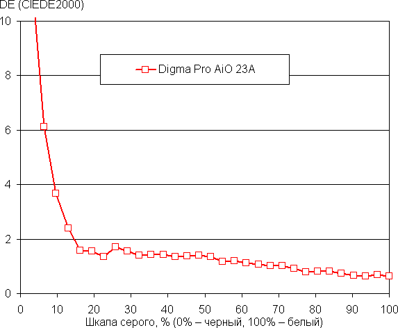 Рост прироста яркости на шкале серого в основном равномерный, и каждый следующий оттенок ярче предыдущего, за исключением двух пар темных оттенков. Впрочем, общей картины это не портит.