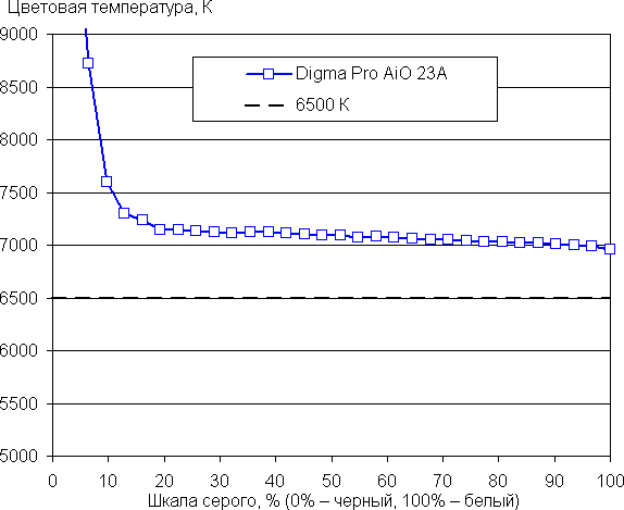 Баланс оттенков на шкале серого хороший, так как цветовая температура не сильно выше стандартных 6500 К, и отклонение от спектра абсолютно черного тела (ΔE) ниже 3, что даже для профессионального устройства считается отличным показателем. При этом цветовая температура и ΔE мало изменяются от оттенка к оттенку — это положительно сказывается на визуальной оценке цветового баланса. (Самые темные области шкалы серого можно не учитывать, так как там баланс цветов не имеет большого значения, да и погрешность измерений цветовых характеристик на низкой яркости большая.)