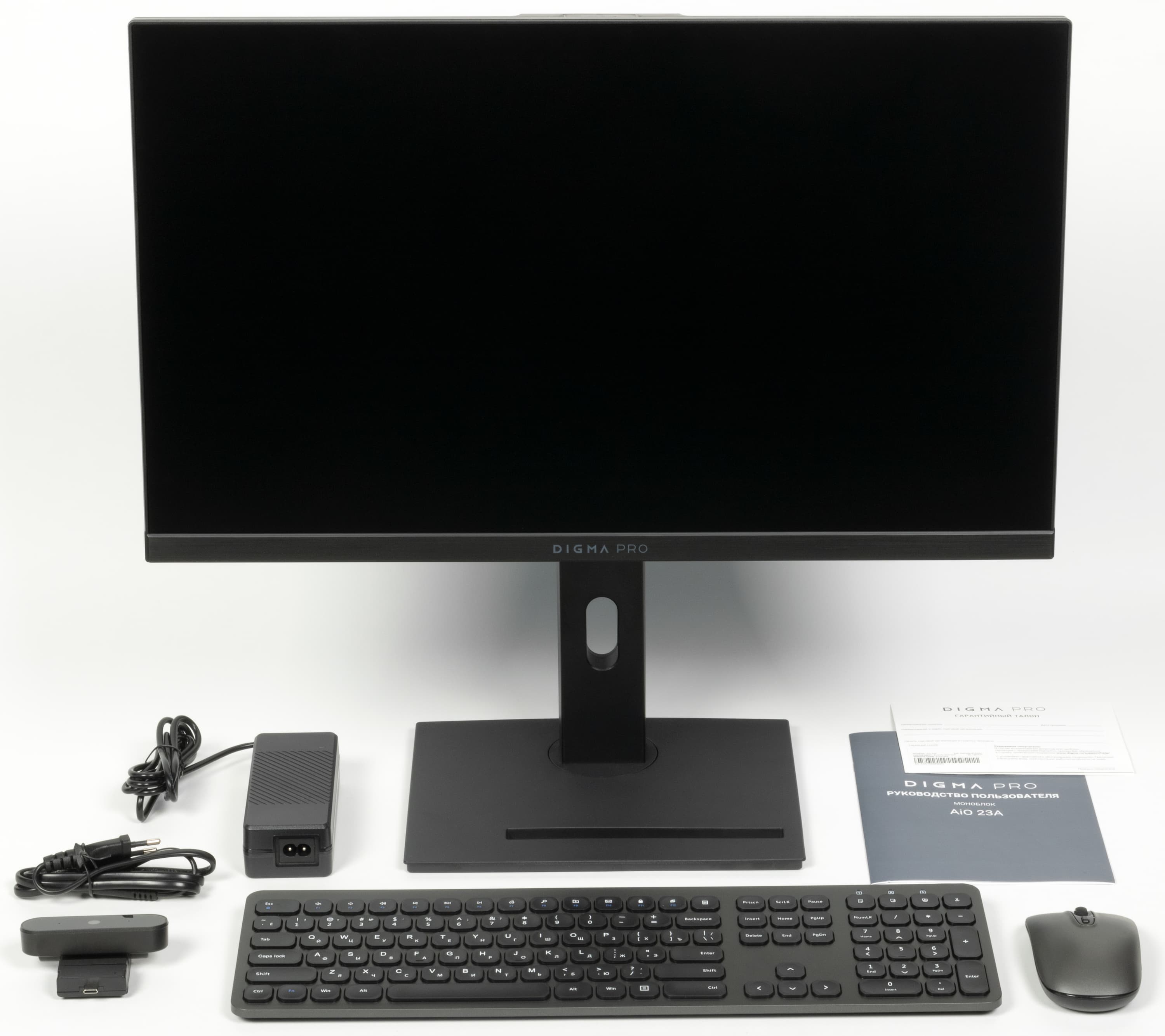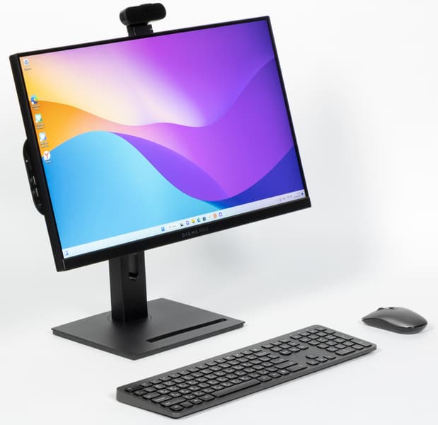 Придумать что-то принципиально новое, выпуская недорогой моноблок, практически невозможно, особенно если речь идет о небольших (с точки зрения современности) диагоналях экрана, типа 24″ (формально 23,8″). Это автоматически означает до сих пор самое массовое разрешение Full HD. Матрицы с большей диагональю, бо́льшим разрешением или тем и другим одновременно банально дороже, так что сочетание 24″ и Full HD является самым ходовым не только в сегменте моноблоков, но и среди отдельных мониторов (где у производителей гибкости больше). Отметить у Digma Pro AiO 23A можно разве что полный комплект, в который входят и мышь с клавиатурой. Операционная система тоже предустановлена, так что — включил и работай в чистом виде. Штатную периферию позднее можно поменять: здесь что мышь, что клавиатура беспроводные, но достаточно простенькие, зато и стоимость комплекта они увеличивают незначительно. В подробном описании они не нуждаются, да и в комплекте 27-дюймового моноблока компании шли точно такие же.